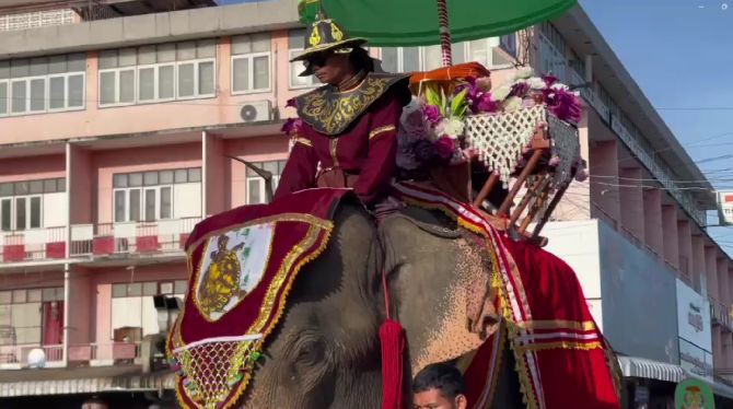 ต่อมาเวลา 07.45 น. ได้ตั้งขบวนแห่กฐินจากหน้าสถานีรถไฟสุรินทร์ ระยะทางประมาณ 1.5 กิโลเมตร ขบวนช้างหนึ่งเชือกนำหน้า พร้อมกลองยาวบรรเลงสร้างสีสันให้บรรยากาศเป็นไปอย่างคึกคัก ชาวบ้านต่างร่วมเดินขบวนด้วยความพร้อมเพรียง