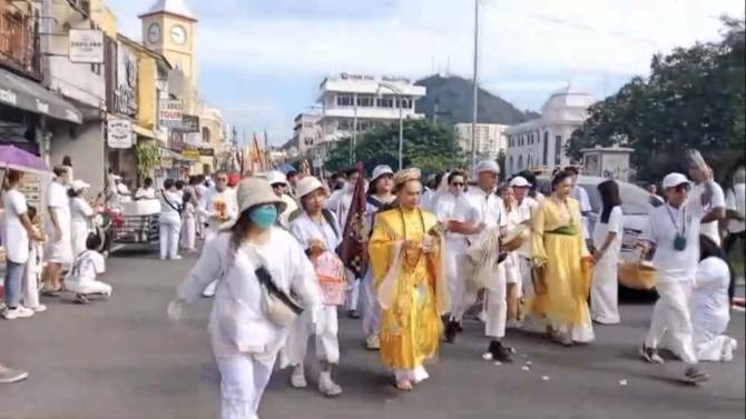 งานประเพณีถือศีลกินผักจังหวัดภูเก็ตประจำปี2568 วันนี้ (28ต.ค.28) ศาลเจ้ากะทู้ ซึ่งเป็นศาลเจ้าเก่าแก่ และเป็นศาลเจ้าต้นกำเนิดของประเพณีถือศีลกินผัก ได้จัดให้มีพิธีแห่พระรอบเมือง โดยตั้งขบวนที่หน้าห้างแม็คโครภูเก็ต ถ.วิชิตสงคราม อ.เมือง ก่อนเคลื่อนขบวนเข้าสู่ตัวเมือง ตลอดสองข้างทางมีประชาชนตั้งโต๊ะรับพระ และมีนักท่องเที่ยวทั้งชาวไทยและต่างชาติที่ออกมาชมขบวนเป็นจำนวนมาก