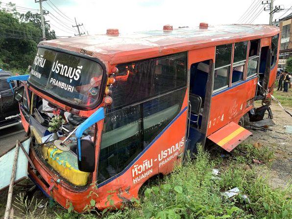 เจ้าหน้าที่กู้ภัย มูลนิธิสว่างหัวหินธรรมสถาน รุดไปยังที่เกิดเหตุ บริเวณทางลงช่องเขาด่าน ก่อนถึงร้านตี๋เฮงติ่มซำประมาณ 50 เมตร พบรถบัสโดยสาร 6 ล้อ สีส้ม หมายเลขข้างรถ 1774-4 ทะเบียน 10-0400 ประจวบฯ สภาพเก่า สภาพเพลารถขาด ล้อหน้าหลุด ชิ้นส่วนกระจัดกระจาย ซีกซ้ายพังเสียหายทั้งแถบ