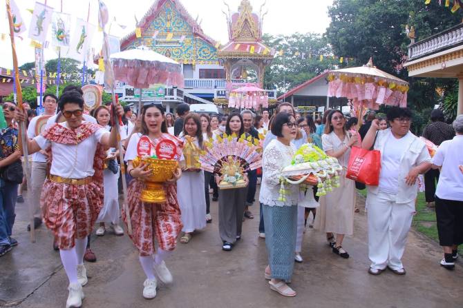 โดยบรรยากาศมีขบวนแห่องค์กฐิน มีแตรวง นางรำ นักเต้น รุ่นเล็ก รุ่นใหญ่ แห่องค์กฐินจากศาลาการเปรียญ ไปวนรอบโบสถ์ 3 รอบ ถึงแม้ฝนจะตก ทางเดินจะเละ ดินเป็นโคลน ต่างก็แห่กันกฐินกันไปอย่างสนุกสนาน โดยเฉพาะน้องบิ๊กและน้องเมย์ จากบริษัท เป็นต่อ แคปปิตอล จำกัด ที่ขอจัดหนัก เสื้อผ้า หน้าผมจัดเต็ม ขอเต้นส่งท้ายเทศกาลงานบุญกฐินปีนี้ ฝนจะตก ตัวจะเปียก จะกี่รอบก็ไม่หวั่น เพราะในมือ มีตัวช่วยคู่กาย ทั้งพัด ทั้งยาดม เลยแดนซ์กระจายแบบไม่ห่วงหล่อ ห่วงสวย อยู่หน้าแตรวง รวมกับนางรำท่านอื่นๆ
