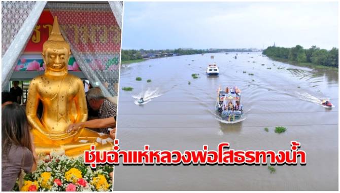 ชุ่มฉ่ำ! แห่หลวงพ่อโสธรทางน้ำ อลังกาลขบวนเรือ 14 ลำ พุทธศาสนิกชนรอสักการะขอพรริมท่าน้ำคึกคัก