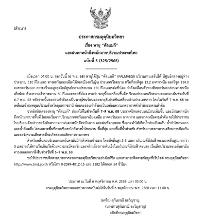 ประกาศกรมอุตุนิยมวิทยา เรื่อง พายุ “คัลแมกี” และฝนตกหนักถึงหนักมากบริเวณประเทศไทย ฉบับที่ 5
