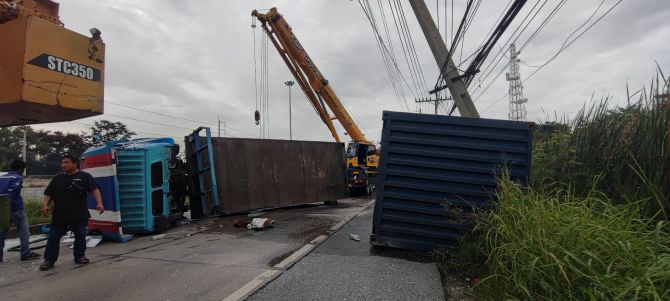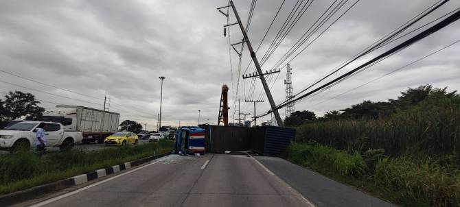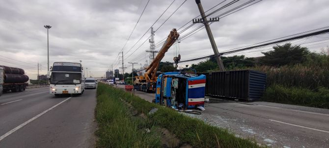 ที่เกิดเหตุพบรถเทรลเลอร์บรรทุกตู้คอนเทนเนอร์พลิกคว่ำ ขวางถนนในช่องคู่ขนาน ทำให้รถไม่สามารถสัญจรผ่านได้ โดยชนเสาไฟฟ้าได้รับความเสียหาย 1 ต้น เป็นรถเทรลเลอร์ยี่ห้ออีซูซุ หมายเลขทะเบียน 72-3155 สระบุรี และหมายเลขทะเบียนตัวพ่วง 72-3155 สระบุรี คนขับคือ นายชรัณ อายุ 51 ปี ชาวจังหวัดสระบุรี ได้รับบาดเจ็บเล็กน้อย