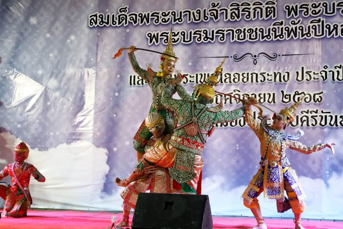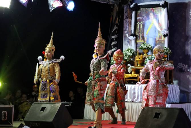จากนั้น ร่วมชมการแสดงศิลปวัฒนธรรมไทย “โขน” ชุด สานศิลป์นาฏกรรม เทิดไท้องค์พระชนนีพันปีหลวง เรื่องรามเกียรติ์ ตอน “ยกทัพ” โดยนักเรียนชุมนุมนาฏยศิลป์ โรงเรียนเทศบาลบ้านค่าย เพื่อสืบสานพระปณิธานของพระองค์ในการอนุรักษ์การแสดงโขน ซึ่งเป็นนาฏศิลป์ชั้นสูงของไทย