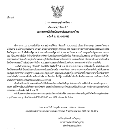 ประกาศกรมอุตุนิยมวิทยา เรื่อง พายุ “คัลแมกี” และฝนตกหนักถึงหนักมากบริเวณประเทศไทย ฉบับที่ 11