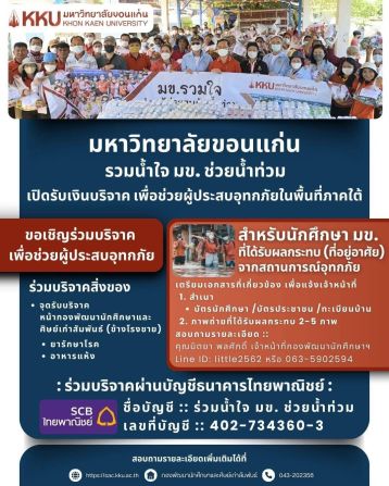 - มข. เปิดพื้นที่ “รวมน้ำใจช่วยภาคใต้” รับบริจาคเงิน–สิ่งของ ส่งต่อ ม.อ. ช่วยผู้ประสบภัยน้ำท่วมใหญ่ 26 พ.ย. 2568