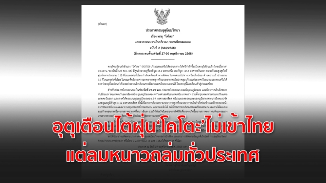 - อุตุเตือน ฉบับที่ 2 ไต้ฝุ่น “โคโตะ” ไม่เข้าไทย แต่ลมหนาวถล่มทั่วประเทศ 27 พ.ย. 2568