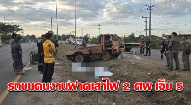 สลด! รถขนคนงานลงท่อเลิกงานกลับบ้าน เสียหลักลงข้างทางฟาดเสาไฟ 2 ศพ เจ็บ 5