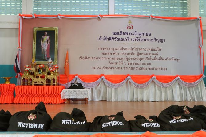 วันที่ 6 ธันวาคม 2568 เวลา 11.30 น. ณ โรงเรียนพนางตุง หมู่ 3 ตำบลพนางตุง อำเภอควนขนุน จังหวัดพัทลุง สมเด็จพระเจ้าลูกเธอ เจ้าฟ้าสิริวัณณวรี นารีรัตนราชกัญญา ทรงพระกรุณาโปรดเกล้าโปรดกระหม่อมให้ พล.อ.ศิวะ ภระมรทัต ผู้แทนพระองค์ เชิญสิ่งของพระราชทาน จำนวน 200 ถุง มอบแก่คณะสงฆ์และราษฎรผู้ประสบอุทกภัยอำเภอควนขนุน จังหวัดพัทลุง ในโอกาสนี้ นายสุจินต์ วาจากิจ รองผู้ว่าราชการจังหวัด รักษาราชการแทนผู้ว่าราชการจังหวัดพัทลุง ได้กล่าวน้อมสำนึกในพระมหากรุณาธิคุณ และร่วมแสดงความปลื้มปีติในน้ำพระราชหฤทัยอันเปี่ยมด้วยความห่วงใยของสมเด็จพระเจ้าลูกเธอ เจ้าฟ้าสิริวัณณวรี นารีรัตนราชกัญญา โดยมี นายธราวุธ ช่วยเกิด รองผู้ว่าราชการจังหวัด นางสาวศรอนงค์ สงสมพันธ์ ปลัดจังหวัด นายอำเภอ และหัวหน้าส่วนราชการ ร่วมในพิธี