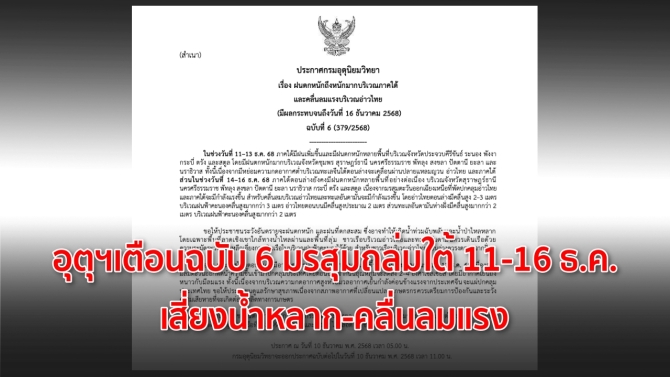 อนึ่ง ในช่วงวันที่ 11 – 13 ธ.ค. 68 หย่อมความกดอากาศต่ำบริเวณทะเลจีนใต้ตอนล่างจะเคลื่อนผ่านปลายแหลมญวน อ่าวไทย และภาคใต้ ทำให้ภาคใต้มีฝนตกหนักหลายพื้นที่ และฝนตกหนักมากบางแห่ง