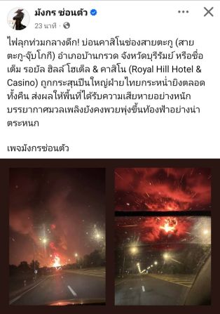 ผู้ใช้เฟซบุ๊กชื่อ “มังกร ซ่อนตัว” ได้โพสต์ภาพท้องฟ้าสีแดง พร้อมเขียนข้อความว่า “ไฟลุกท่วมกลางดึก! บ่อนคาสิโนช่องสายตะกู (สายตะกู–จุ๊บโกกี) อำเภอบ้านกรวด จังหวัดบุรีรัมย์ หรือชื่อเต็ม Royal Hill Hotel & Casino ถูกกระสุนปืนใหญ่ฝ่ายไทยยิงถล่มตลอดทั้งคืน ส่งผลให้พื้นที่เสียหายหนัก มวลเพลิงยังพวยพุ่งขึ้นท้องฟ้าอย่างน่าตระหนก”