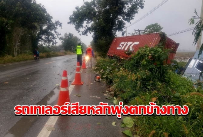 ฝนตกถนนลื่น! รถเทเลอร์เสียหลักพุ่งตกข้างทาง โชคดีคนขับปลอดภัย