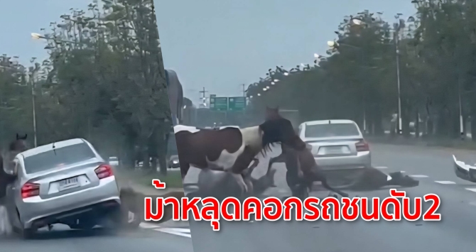 ฝูงม้าหลุดคอกวิ่งตัดเพชรเกษม รถเก๋งชนดับ 2 เจ็บ 3
