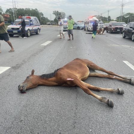ที่เกิดเหตุพบรถยนต์เก๋งยี่ห้อฮอนด้า สีดำ อยู่ในสภาพด้านหน้ารถได้รับความเสียหายจากการเฉี่ยวชน โดยมีนายธรรศ ชาวกรุงเทพมหานคร เป็นผู้ขับขี่ ใกล้กันพบม้าถูกรถชนเสียชีวิตในที่เกิดเหตุ 2 ตัว และได้รับบาดเจ็บอีก 3 ตัว รวม 5 ตัว ทราบว่าเป็นม้าของนางสุวิชญา ชาวจังหวัดราชบุรี ซึ่งเป็นเจ้าของคอกม้าในพื้นที่ดังกล่าว