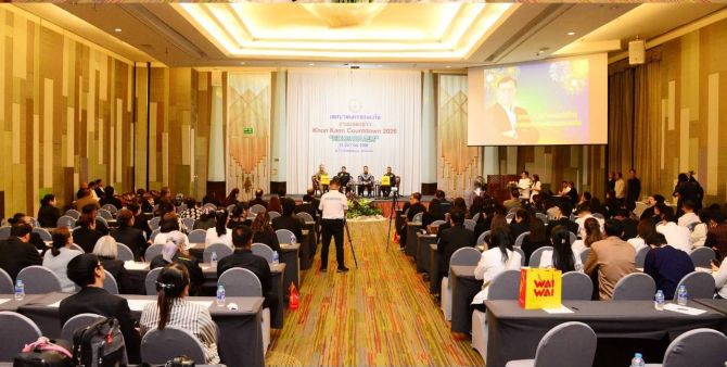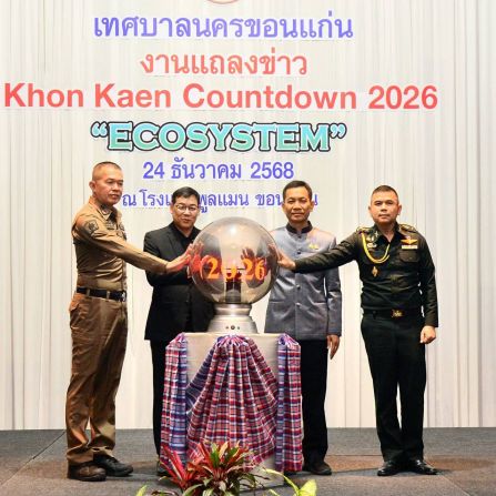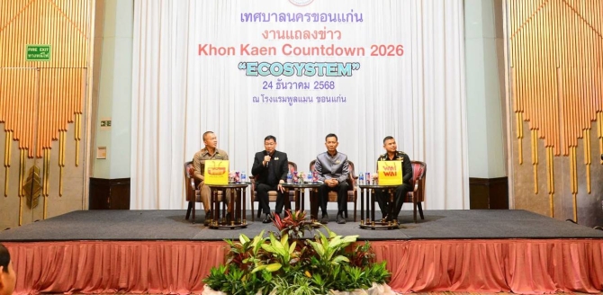 เมื่อเวลา 10.30 น. วันที่ 24 ธันวาคม พ.ศ. 2568 ที่ ห้องออคิด 1 โรงแรมพลูแมน ขอนแก่น ราชา ออคิด เทศบาลนครขอนแก่น นายพันธ์เทพ เสาโกศล รองผู้ว่าราชการจังหวัดขอนแก่น เป็นประธานในพิธีแลงข่าวกิจกรรมส่งท้ายปีเก่าต้อนรับปีใหม่ งานขอนแก่นเคาท์ดาวน์ 2026 “ECOSYSTEM” พร้อมเสริมความสิริมงคลในพิธีทำบุญตักบาตรวันขึ้นปีใหม่ โดยมี นายประสิทธิ์ ทองแท่งไทย นายกเทศมนตรีเทศบาลนครขอนแก่น พร้อมด้วยพันเอก สหภาพ ปุตรลา รองเสนาธิการ มณฑลทหารบกที่ 23, พ.ต.อ.ธนาวัชร ดีบุญมี ณ ชุมแพ รองผู้บังคับการตำรวจภูธรจังหวัดขอนแก่น ร่วมเป็นผู้แถลงข่าวในครั้งนี้ด้วย ท่ามกลางแขกผู้มีเกียรติและพี่น้องสื่อมวลชนที่มาร่วมงาน