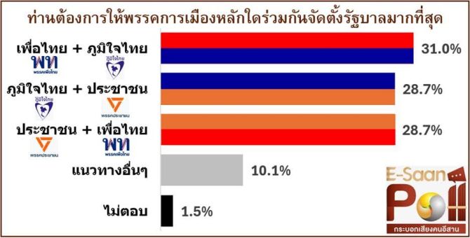 เมื่อสอบถามถึงรูปแบบรัฐบาลผสมที่ต้องการมากที่สุด พบว่า ความเห็นของประชาชนมีคะแนนใกล้เคียงกันทั้ง 3 สูตร ได้แก่ เพื่อไทยจับมือภูมิใจไทย ร้อยละ 31.0 ภูมิใจไทยร่วมกับพรรคประชาชน ร้อยละ 28.7 และพรรคประชาชนจับมือเพื่อไทย ร้อยละ 28.7