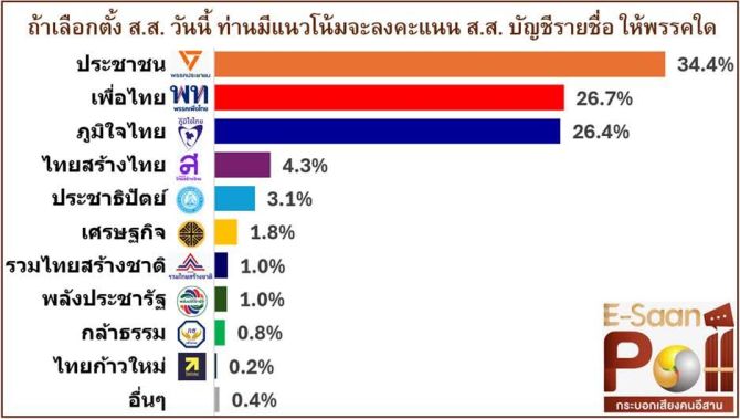 ผลสำรวจความคิดเห็นด้านคะแนนนิยม ส.ส.บัญชีรายชื่อ จากกลุ่มตัวอย่าง 1,151 คน ใน 20 จังหวัดภาคอีสาน ระหว่างวันที่ 19–25 ธันวาคม 2568 ระบุว่า หากมีการเลือกตั้งในวันนี้ พรรคประชาชนได้คะแนนสูงสุดร้อยละ 34.4 เพิ่มขึ้นจากร้อยละ 33.2 ในปี 2566 รองลงมาคือพรรคเพื่อไทย ร้อยละ 26.7 ลดลงจากร้อยละ 43.1 และพรรคภูมิใจไทย ร้อยละ 26.4 เพิ่มขึ้นจากร้อยละ 4.1 อย่างก้าวกระโดด ขณะที่พรรคอื่น ๆ ได้คะแนนรวมในสัดส่วนไม่สูงนัก
