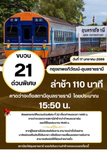 สถานีรถไฟอุบลราชธานี ประกาศขบวนรถล่าช้า วันที่ 17 ม.ค.69 20:56 น.- เครนทับรถไฟสีคิ้ว 3 ชีวิตดับ ญาติเรียกร้องความรับผิด 20:22 น.