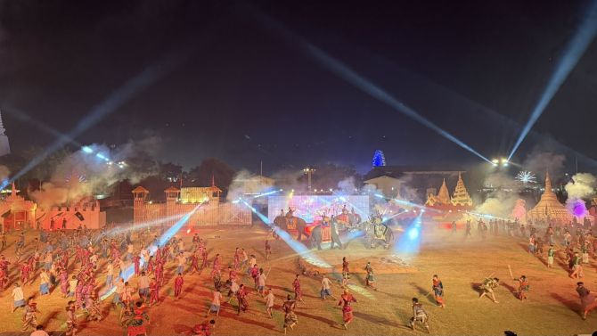 จากนั้นรับชมการแสดง “ยุทธหัตถี” ประกอบแสง สี เสียง ถ่ายทอดเหตุการณ์ทางประวัติศาสตร์เมื่อกว่า 400 ปีก่อน อย่างยิ่งใหญ่ตระการตา ด้วยช้างจริง ม้าจริง และฉากสถานที่จริง สร้างความประทับใจแก่ผู้ชมอย่างยิ่ง