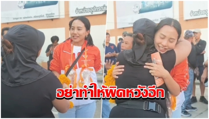 ท่ามกลางเสียงโห่ร้องและป้ายการเมืองที่ปะทะกันทางอารมณ์ แม่ค้าขายข้าวโพดวัยกลางคนรายหนึ่ง ตัดสินใจ ฝ่ากลุ่มผู้คนเข้าไปหาไอซ์แบบไม่หวั่นเสียงกดดัน ก่อนจะยื่นพวงมาลัย โผเข้ากอดแน่น และกระซิบยาวข้างหูไอซ์ด้วยสีหน้าที่สะท้อนความทุกข์ใจราวกับแบกโลกทั้งใบไว้บนบ่าวินาทีนั้น จากเสียงโห่ กลายเป็นความเงียบ จากความเดือด กลายเป็นความอึ้ง—ผู้คนรอบข้างหยุดมองเหตุการณ์ตรงหน้าอย่างไม่กะพริบตา