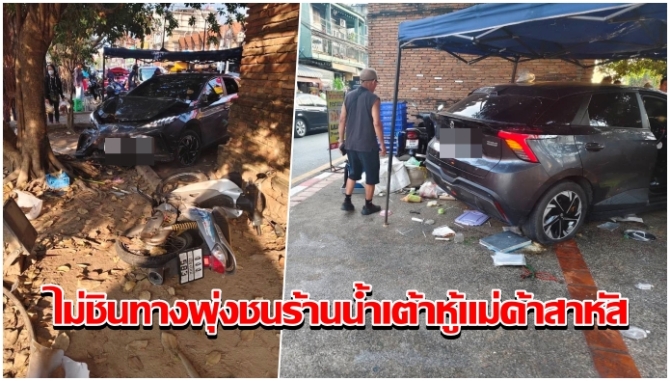 คนขับแกร็บคาร์ไม่ชินทาง เสียหลักพุ่งชนร้านน้ำเต้าหู้ริมทาง แม่ค้าสาหัส 2 ผู้โดยสารต่างชาติเจ็บ