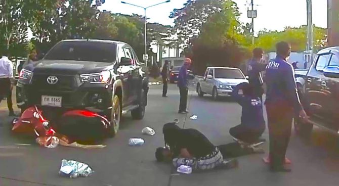 ที่เกิดเหตุพบรถกระบะยี่ห้อโตโยต้า สีดำ ทะเบียน กท 6665 ปทุมธานี จอดอยู่ริมถนน โดยมีรถจักรยานยนต์ยี่ห้อยามาฮ่า รุ่นฟีโน่ สีแดง ทะเบียน 7ขอ 8343 กรุงเทพมหานคร ถูกชนอัดติดอยู่บริเวณด้านหน้ารถ