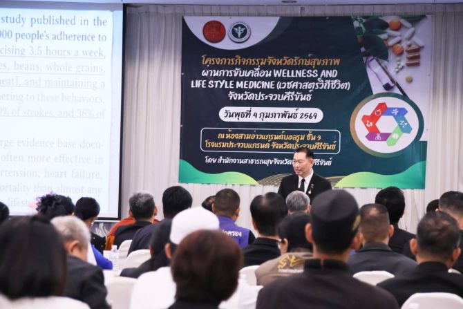 เมื่อวันที่ 4 กุมภาพันธ์ 2569 ที่โรงแรมประจวบแกรนด์ อำเภอเมืองประจวบคีรีขันธ์ นายสิทธิชัย สวัสดิ์แสน ผู้ว่าราชการจังหวัดประจวบคีรีขันธ์ เป็นประธานเปิดโครงการ “จังหวัดรักษ์สุขภาพ ผ่านการขับเคลื่อน Wellness และ Lifestyle Medicine (เวชศาสตร์วิถีชีวิต)” โดยมี พระราชรัตนวิสุทธิ์ เจ้าคณะจังหวัดประจวบคีรีขันธ์ เจ้าอาวาสวัดกุยบุรี นพ.ปรีชา เปรมปรี ผู้ตรวจราชการกระทรวงสาธารณสุข เขตสุขภาพที่ 5 รศ.ดร.นพ.ภูดิท เตชาติวัฒน์ ผู้อำนวยการสถาบันสุขภาวะพิสิฐ และนายกสมาคมโค้ชเวชศาสตร์วิถีชีวิตและเวลเนสไทย รวมถึงรองผู้ว่าราชการจังหวัด หัวหน้าส่วนราชการ ผู้แทนภาครัฐ เอกชน ภาคประชาสังคม และสถาบันการศึกษา เข้าร่วมรับฟังอย่างพร้อมเพรียง