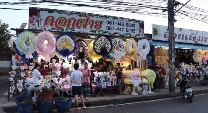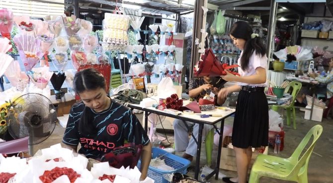 โดยเฉพาะร้าน “ดอกฝ้าย” ภายในร้านพนักงานต่างเร่งจัดทำออเดอร์ช่อดอกกุหลาบกลิตเตอร์อย่างคึกคัก ช่อดังกล่าวใช้ริบบิ้นขึ้นรูปเป็นดอกกุหลาบ ตกแต่งด้วยผงกลิตเตอร์หรือกากเพชร เพิ่มความแวววาวสะท้อนแสง ทำให้ดูโดดเด่น หรูหรา และเป็นที่นิยมในกลุ่มลูกค้าอย่างมาก