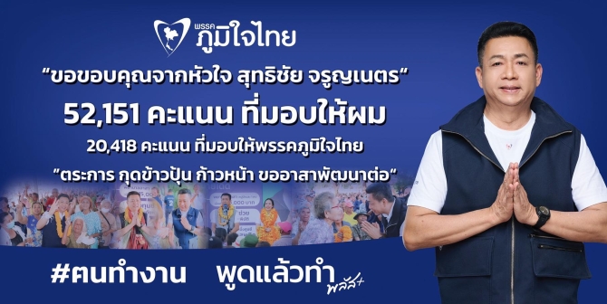 วันนี้ ( 15 ก.พ.69 ) ผู้สื่อข่าวของเรารายงานว่า นายสุทธิชัย จรูญเนตร ( หน่อย ) ว่าที่ สส.อุบลราชธานี เขต 5 (อำเภอตระการพืชผล และ อำเภอกุดข้าวปุ้น) พรรคภูมิใจไทย ได้กล่าวขอบคุณพ่อแม่พี่น้องประชาชนในเขตเลือกตั้งที่ 5 จ.อุบลฯ ผ่านสำนักข่าวบ้านเมืองออนไลน์(หนังสือพิมพ์บ้านเมือง) ว่า “ ผมขอขอบคุณทุกคะแนนเสียงจากพี่น้องชาวอุบลราชธานี เขต 5 (อ.ตระการพืชผล อ.กุดข้าวปุ้น) ที่เมตตามอบความไว้วางใจให้ผม นายสุทธิชัย จรูญเนตร ได้ทำหน้าที่ ผู้แทนบ้านเฮา อีกครั้ง ขอบคุณสำหรับ 52,151 คะแนน ที่มอบให้ผม จากนี้ไป ผมจะตั้งใจทำงานให้เต็มที่ และดีที่สุดเพื่อพี่น้องชาวตระการพืชผล และชาวกุดข้าวปุ้น ครับ และขอบคุณคะแนนที่พ่อแม่พี่น้องมอบให้กับพรรคภูมิใจไทยในเขต 5 จำนวน 20,418 คะแนน ”