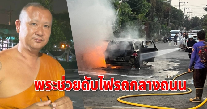 พระใจเด็ดวิ่งจีวรบินคว้าถังดับเพลิงระงับเหตุไฟไหม้รถขณะบิณฑบาต