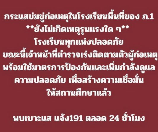 วันที่ 18 กุมภาพันธ์ 2569 พล.ต.ต.ภัคพงศ์ สายอุบล ผบก.อก.ภ.1 ในฐานะ รองโฆษกตำรวจภูธรภาค 1 ปฏิบัติหน้าที่แทนโฆษก ตร.ภ.1 เปิดเผยว่าทาง พล.ต.ท.วัฒนา ยี่จีน ผบช.ภ.1 ได้มีความห่วงใยในพื้นที่และประชาชนที่อาจจะมีความเกี่ยวข้องกับการเดือดร้อนของ การกระทำของคนร้ายดังกล่าว โดยให้ความมั่นใจว่า ตำรวจภูธรภาค 1 จะติดตามและจับกุมคนร้ายและควบคุมป้องกัน เหตุที่จะเกิดขึ้นกับประชาชนรวมถึง โรงเรียนและเด็กนักเรียนต่างๆในเขตพื้นที่ตำรวจภูธรภาค 1 โดยได้สั่งการให้ ผู้บังคับการจังหวัดทุกจังหวัดและ ผู้บังคับการการสืบสวน ภ.1 ได้ส่งกำลังเจ้าหน้าที่ ชุดปฏิบัติการสืบสวนปราบปราม ออกไปตรวจตราดูแลความปลอดภัยให้กับ ประชาชนและโรงเรียน ตลอดจนนักเรียนต่างๆในพื้นที่ อย่างเต็มที่ทันทีเพื่อป้องกันเหตุร้ายที่อาจจะเกิดขึ้น โดยผู้ได้พบเบาะแสคนร้ายหรือต้องการความช่วยเหลือใดๆ ขอให้ติดต่อที่สถานีตำรวจใกล้บ้านของท่านหรือหมายเลขสายด่วน 191 ได้ตลอด 24 ชั่วโมง