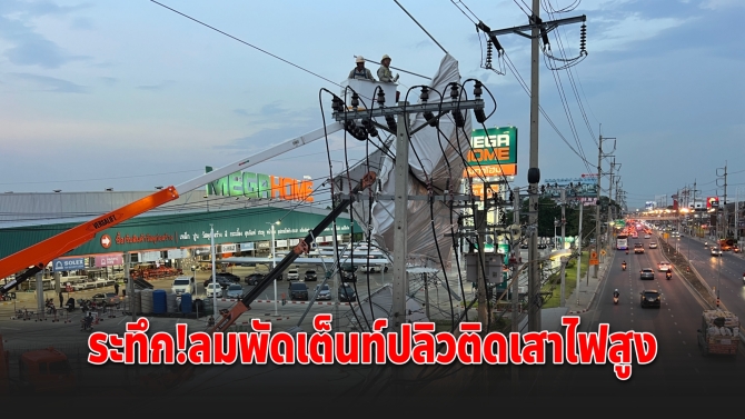 ระทึก! ลมกรรโชกพัดเต็นท์ปลิวติดเสาไฟแรงสูง ถนนติวานนท์ไฟดับบางส่วน