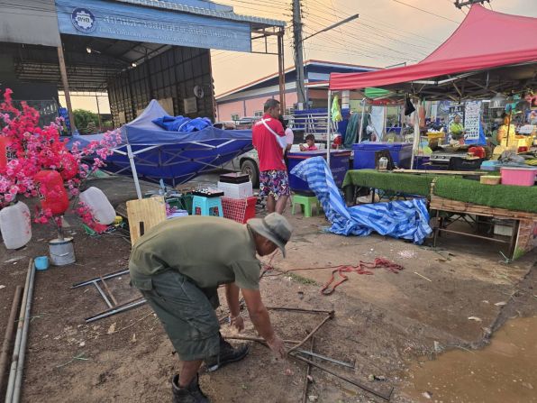 จากภาพกล้องวงจรปิด เผยให้เห็นช่วงจังหวะที่แม่ค้ากำลังจะนำรถเข้าไปหลบในอาคาร แต่เมื่อเห็นท่าไม่ดีจึงวิ่งหนีออกมา ก่อนที่โครงเหล็กและหลังคาเต็นท์จะปลิวล้มใส่รถจักรยานยนต์อย่างแรง หากช้ากว่านั้นเพียงไม่กี่วินาที อาจเกิดอันตรายถึงชีวิตได้