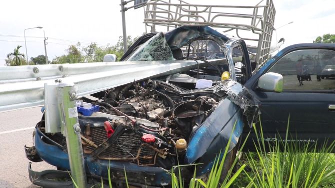 เฉียดตาย! การ์ดเรลเสียบทะลุรถกระบะ คนขับดวงแข็งรอดปาฏิหาริย์