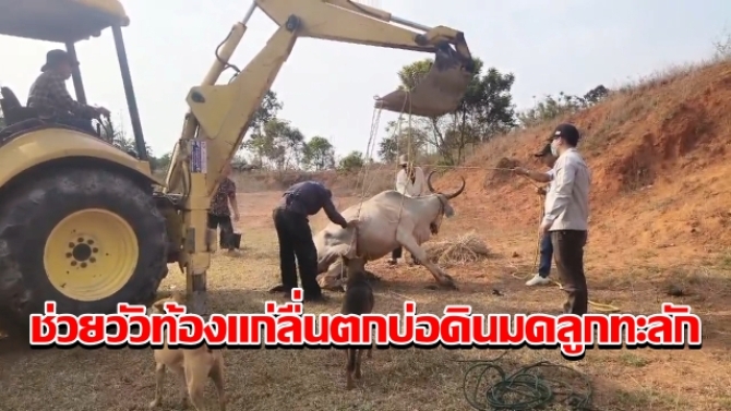 ระทึก! วัวท้องแก่ลื่นตกบ่อดินลึกกว่า 2 เมตร มดลูกทะลัก เจ้าหน้าที่เร่งเข้าช่วย