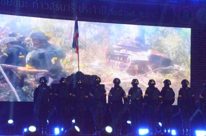 ไฮไลต์สำคัญคือการแสดงจำลองเหตุการณ์ทางประวัติศาสตร์ พร้อมเทคนิคแสง สี เสียง และเอฟเฟกต์สมจริง สร้างความตื่นตาตื่นใจให้ผู้ชม โดยเฉพาะฉากการปฏิบัติภารกิจของทหารไทยที่ถ่ายทอดออกมาอย่างเข้มข้น ท่ามกลางเสียงเอฟเฟกต์และบรรยากาศเสมือนจริง สร้างความประทับใจและเสียงปรบมือจากผู้ชมทั้งสนาม