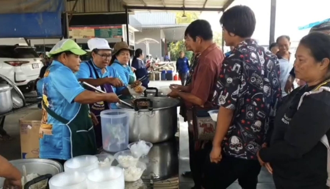 เจ้าอาวาสวัดดังสุโขทัยนำรถโรงทานทำอาหารแจกชาวบ้านมารอคิวซื้อน้ำมัน