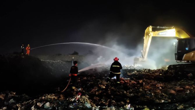 ที่เกิดเหตุพบเพลิงลุกไหม้กองขยะเป็นวงกว้าง มีควันพวยพุ่งจำนวนมาก เจ้าหน้าที่ต้องแบ่งกำลังฉีดน้ำสกัดเพลิงเป็นแนว เพื่อป้องกันการลุกลาม เนื่องจากกองขยะมีการทับถมจำนวนมากและสะสมความร้อนสูง ทำให้เกิดการปะทุเป็นระยะ อีกทั้งกระแสลมแรงยังพัดประกายไฟไปยังกองขยะใกล้เคียง เพิ่มความยากลำบากในการควบคุมสถานการณ์