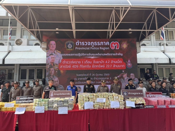 เมื่อวันที่ 26 มีนาคม 2569 ณ กองบัญชาการตำรวจภูธรภาค 3 พล.ต.ท.พฤทธิพงษ์ ประยูรศิริ ผบช.ภ.3 พร้อมด้วย นายมานพ แสงโสตร์ ผอ.ปส.ภาค 3 และคณะ ร่วมแถลงผลการปราบปรามยาเสพติดเชิงรุกตามนโยบายรัฐบาล โดยในห้วงเดือนที่ผ่านมาสามารถทลายเครือข่ายสำคัญได้ถึง 10 เครือข่าย ยึดยาบ้าสะสม 4,750,000 เม็ด ไอซ์ 409 กิโลกรัม และยึดทรัพย์สินที่เกี่ยวข้องรวม 22.7 ล้านบาท