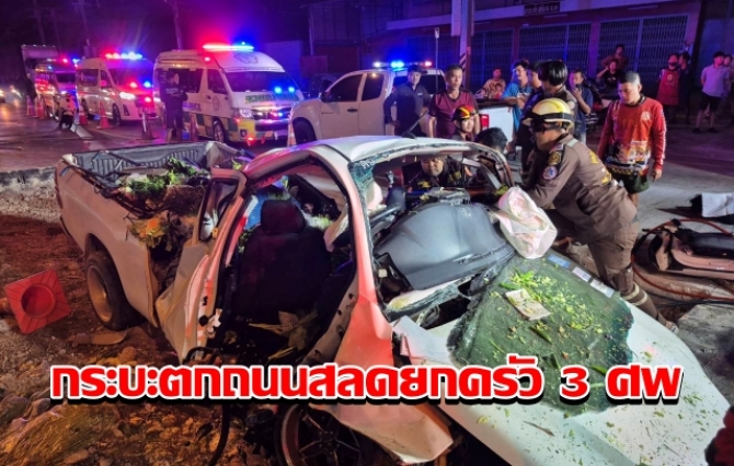 สลดยกครัว 3 ศพ กระบะขนผักเสียหลักตกถนนซ่อมสร้างพ่อแม่ลูกดับคาซาก