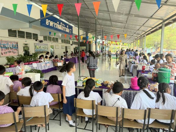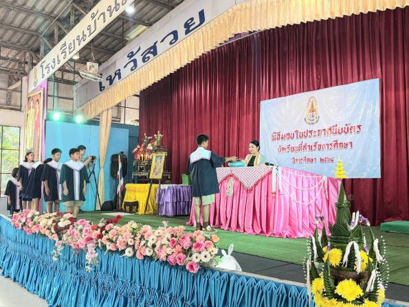 ขณะที่ตัวแทนนักเรียนชั้นมัธยมศึกษาปีที่ 3 สะท้อนความรู้สึกผูกพันต่อโรงเรียน โดยระบุว่า โรงเรียนบ้านม่วงเปรียบเสมือนบ้านหลังที่สอง และเป็นสถานที่ที่หล่อหลอมทั้งความรู้และความสัมพันธ์ที่ดี พร้อมฝากถึงรุ่นน้องให้ตั้งใจเรียนและพัฒนาตนเองอย่างต่อเนื่อง