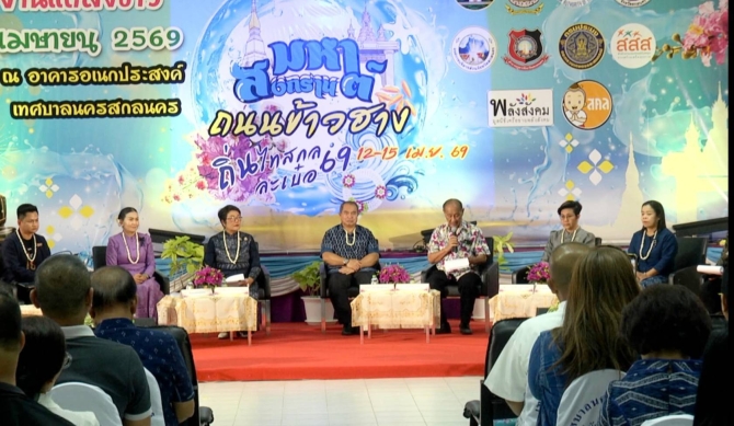วันที่ 2 เมษายน 2569 ที่อาคารเอนกประสงค์ เทศบาลนครสกลนคร นายเอกภพโสภณ รอง ผวจ สกลนคร พร้อมหน่วยงานที่เกี่ยวข้อง ร่วมแถลงข่าวจัดงานมหาสงกรานต์ถิ่นไทสกลละเบ๋อ ระหว่างวันที่ 12-15 เมษายน 2569 ซึ่งจัดโดยเทศบาลนครสกลนคร โดยชื่อข้าวฮางเป็นผลผลิตของเกษตรกรได้ผลิตขึ้นและมีชื่อเสียงเป็นข้าวที่มีคุณภาพ จุดเด่นข้างฮางคือเป็นเมล็ดข้าวที่มีส◌ีทอง เมื่อหุงสุกจะมีกลิ่นหอม จึงใช้ชื่อสงกรานต์ถนนข้าวฮางมาตั้งแต่ปี 2553 ซึ่งกิจกรรมระหว่างวันที่ 12-15 เมษายน มีการทำบุญตักบาตร ปล่อยปลา ขบวนแห่สงกรานต์ กิจกรรมก่อพระทราย บูชาพระ สักการะองค์พระธาตุเชิงชุม รดน้ำดำหัวผู้สูงอายุ กิจกรรมเล่นน้ำสงกรานต์ มนพื้นที่ปลอดภัยไร้แอลกอร์ฮอล์ เทศกาลแาหารสงกรานต์ไทสกล มหกรรมอาหารปลอดภัย ซึ่งปีนี้เทศบาลฯ ร่วมกับส่วนราชการและภาคเอกชน ได้กำหนดพื้นที่ปลอดภัยให้กับเด็ก เยาวชนและประชาชนที่มาร่วมงาน ณ บริเวณลานพระบรมราชาสวรีย์ รัชกาลที่ 5 ดังนั้นขอความร่วมมือจากผู้ผระกอบการร้านค้า มีส่วนอนุรักษ์วัฒนธรรมอันดี ดข้มงวดในการห้ามจำหน่ายจ่ายแจกเครื่องดื่มืี่มีแอลกอร์ฮอล์ โดยมี จนท.กวดขันใหล้ชิดซึ่งจะเป็นการลดการเกิดอุบัติเหตุในช่วงเทศกาลสงกรานต์ ขอเชิญชวนประชาชนและนักท่องเที่ยวมาร่วมที่ถนนสงกรานต์กันเยอะๆ