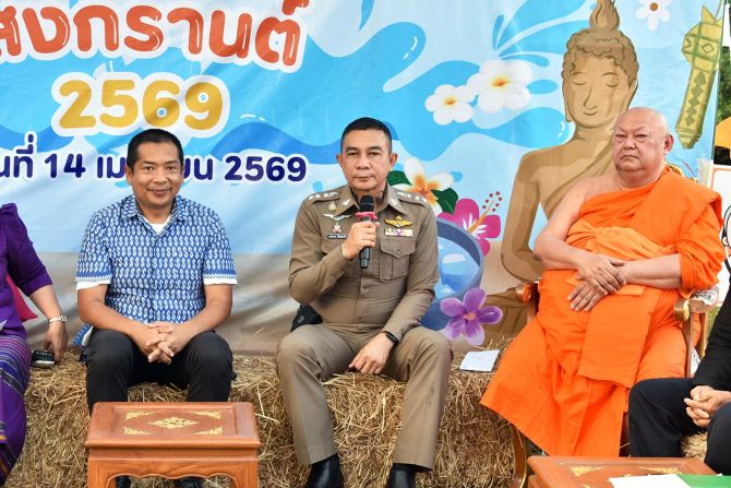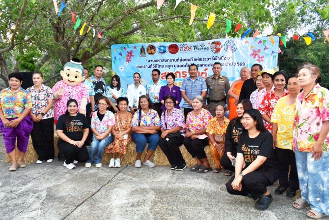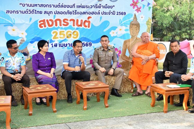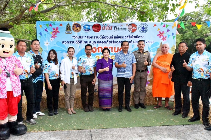 เมื่อวันที่ 2 เม.ย.69 ที่บริเวณท่าน้ำวัดนาห้วย อ.ปราณบุรี จ.ประจวบฯ นายราม สิงหโศภิษฐ์ นายอำเภอปราณบุรี, นางอุบลวรรณ คงสว่าง ผจก.สำนักงานเครือข่ายองค์กรงดเหล้าภาคตะวันตก สำนักงานกองทุนสนับสนุนการสร้างเสริมสุขภาพ (สสส.), นายสถาพร ก้อนเมฆ นายก อบต.ปราณบุรี, นายธเนศพล วงศ์สวาท ผญบ.หมู่ 3 บ้านนาห้วย, นายบุญมี สำมณี ประธานสภาวัฒธรรมอำเภอปราณบุรี, พ.ต.อ.หงส์พรหม วิศิษฐ์ชนะชัย ผกก.สภ.ปราณบุรี และพระครูปลัดวชิรานันท์ วชิราวุโธ เจ้าคณะตำบลปราณบุรี เจ้าอาวาสวัดนาห้วย ร่วมแถลงข่าวการจัดงานประเพณี “มหาสงกรานต์ล่องนที แห่พระวารีเข้าเมือง” สงกรานต์วิถีไทย สนุก ปลอดภัย ไร้แอลกอฮอล์ ท่ามกลางแขกผู้มีเกียรติจำนวนมากสวมเสื้อลายดอกสีสันสดใสร่วมรับฟัง