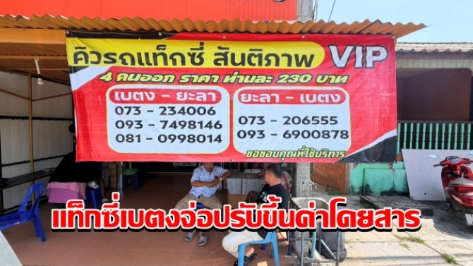 เมื่อวันที่ 3 เมษายน 2569 ที่คิวรถแท็กซี่ยะลา เบตง นายมนัส บือนา นายคิวรถแท็กซี่ ยะลา - เบตง เปิดเผยว่า ในช่วงหลังวันที่ 6 เม.ย.2569อาจจะมีการปรับราคาค่าโดยสารขึ้นซึ่งในวันนี้ยังคงตรึงราคาค่าโดยสารคนละ 230 บาทในอัตราเดิม เพื่อบรรเทาภาระค่าใช้จ่ายประชาชนก่อนช่วงเทศกาลสงกรานต์ จากนั้นจะมีการประชุมหารือของผู้ประกอบการรถแท็กซี่ยะลา - เบตง หลังวันที่ 6 เมษายนนี้