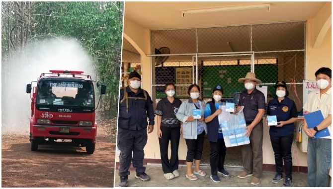 เทศบาลตำบลเชิงดอย ห่วงใยชุมชนนำรถบรรทุกน้ำ ฉีดพ่นละอองเพื่อลดค่าฝุ่นควัน PM 2.5 มอบหน้ากาก KN95-N95
