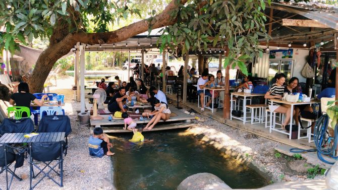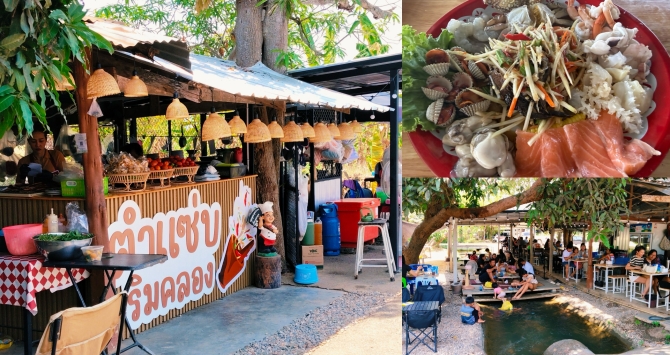 จุดเด่นของร้านคือบรรยากาศติดคลองธรรมชาติ ร่มรื่น เย็นสบาย โดยลูกค้าสามารถลงเล่นน้ำบริเวณหน้าร้านได้ทันที พร้อมนั่งรับประทานอาหารไปด้วย กลายเป็นประสบการณ์คลายร้อนที่หลายคนเรียกว่า “กินไป แช่น้ำไป” สร้างความสนุกสนานและความผ่อนคลายได้ในเวลาเดียวกัน