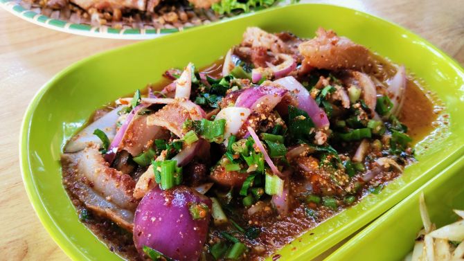 ด้านอาหารมีให้เลือกหลากหลายเกือบ 100 เมนู ทั้งส้มตำ ยำ และอาหารอีสานรสจัดจ้าน เมนูแนะนำ ได้แก่ ไก่ย่างสูตรเฉพาะ ส้มตำทอด ปลาทับทิมทอดยำ และตำรวมถาด ราคาจับต้องได้ ถูกใจทั้งนักท่องเที่ยวและคนท้องถิ่น