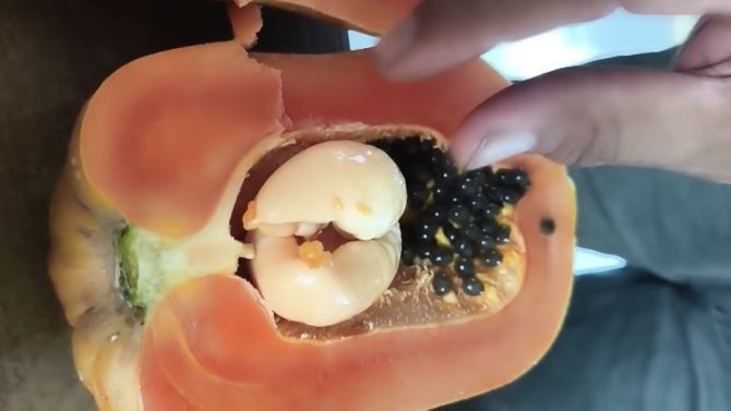 พะเยา-เมื่อวันที่ 6 เมษายน 2569 ผู้สื่อข่าวรายงานว่า ที่ตำบลบ้านเหล่า อำเภอแม่ใจ จังหวัดพะเยา เกิดเหตุการณ์แปลกสร้างความฮือฮาในพื้นที่ หลังชาวบ้านรายหนึ่งนำมะละกอสุกจากสวนหลังบ้านมาผ่าเตรียมรับประทาน แต่กลับพบสิ่งผิดปกติอยู่ภายในผล