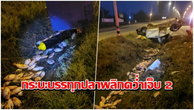 กระบะบรรทุกปลาหลับในเสียหลักพลิกคว่ำชนเสาไฟฟ้า เจ็บ 2 ราย