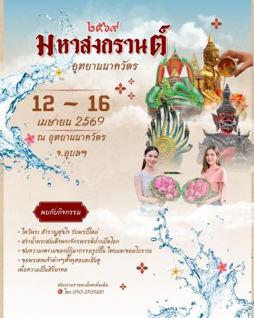 อุทยานนาควัตร บ้านหนองบ่อ ต.หนองบ่อ อ.เมือง จ.อุบลราชธานี เตรียมจัดงานวันมหาสงกรานต์ ประจำปี 2569 ระหว่างวันที่ 12–16 เมษายน เชิญชวนนักท่องเที่ยวและประชาชนร่วมสืบสานประเพณีปีใหม่ไทย พร้อมทำบุญสรงน้ำและขอพรสิ่งศักดิ์สิทธิ์เพื่อความเป็นสิริมงคล